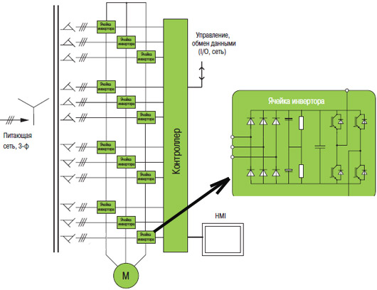 инверторных ячеек. Количество используемых ячеек определяется необходимым напряжением на выходе преобразователя частоты. Большое количество ячеек обеспечивает маленький „шаг“ результирующей кривой напряжения, и, как следствие, отсутствие негативного влияния на обмотки двигателя. Смещение вторичных обмоток трансформатора позволяет получить эквивалент многопульсной схемы выпрямления и синусоидальную кривую тока, потребляемого из сети.